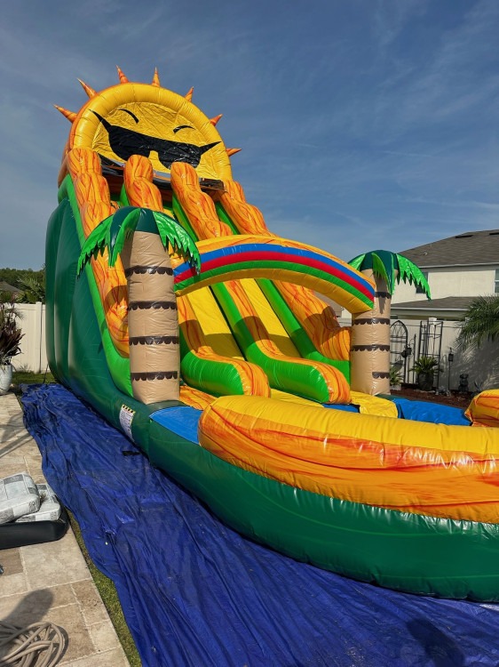 "Sunshine Paradise Unveiled: Our 22-Foot Double Slide Dry/Wet Edition! Immerse yourself in a radiant paradise with our inflatable combo. Whether bouncing in the dry area or sliding into refreshing waters, this 22-foot double slide guarantees a day of excitement, making it the perfect centerpiece for birthdays and events that crave a sunshine-filled adventure."